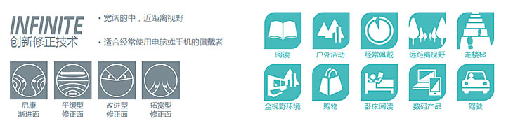Nikon INFINITE系列產(chǎn)品之一的Presio Digilife漸進(jìn)多焦點(diǎn)鏡片,在原有的平緩型修正面與改進(jìn)型修正面基礎(chǔ)上,加大加寬了中低位區(qū)的視域,使中、近距離視野更加寬闊。