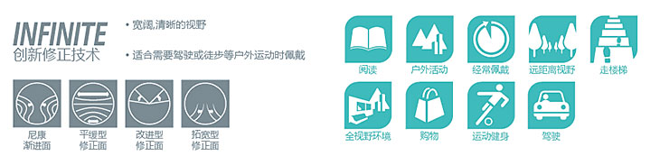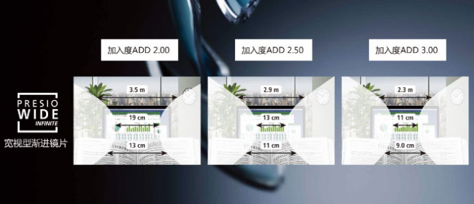 Nikon INFINITE系列產(chǎn)品之一的Presio Wide漸進(jìn)多焦點(diǎn)鏡片,在原有的平緩型修正面與改進(jìn)型修正面基礎(chǔ)上,將視遠(yuǎn)區(qū)變寬12%,提供更廣闊的視野。