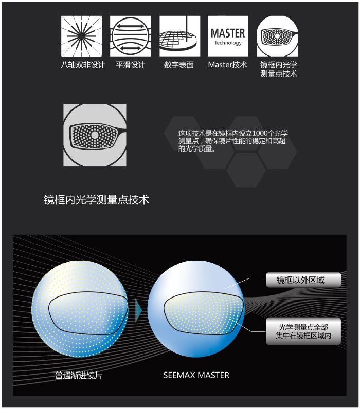 鏡框內(nèi)光學(xué)質(zhì)量點(diǎn)技術(shù),該技術(shù)是在鏡框內(nèi)設(shè)計(jì)1000個(gè)光學(xué)測(cè)量點(diǎn),確保鏡片性能的穩(wěn)定和光學(xué)質(zhì)量高度精準(zhǔn)。