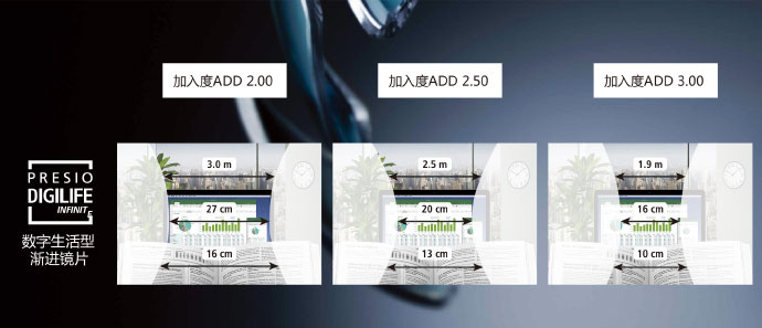 Nikon INFINITE系列產(chǎn)品之一的Presio Digilife漸進(jìn)多焦點(diǎn)鏡片,在原有的平緩型修正面與改進(jìn)型修正面基礎(chǔ)上,加大加寬了中低位區(qū)的視域,使中、近距離視野更加寬闊。
